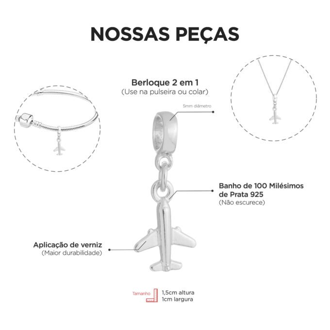 MODELO: Berloque Avião Viagem banhada com 100 milésimos de prata 925.