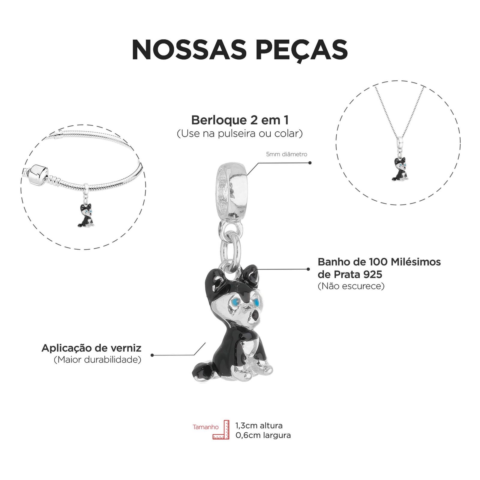 Peça banhada com 100 milésimos de prata 925, aplicação de verniz e 1 ano de garantia.