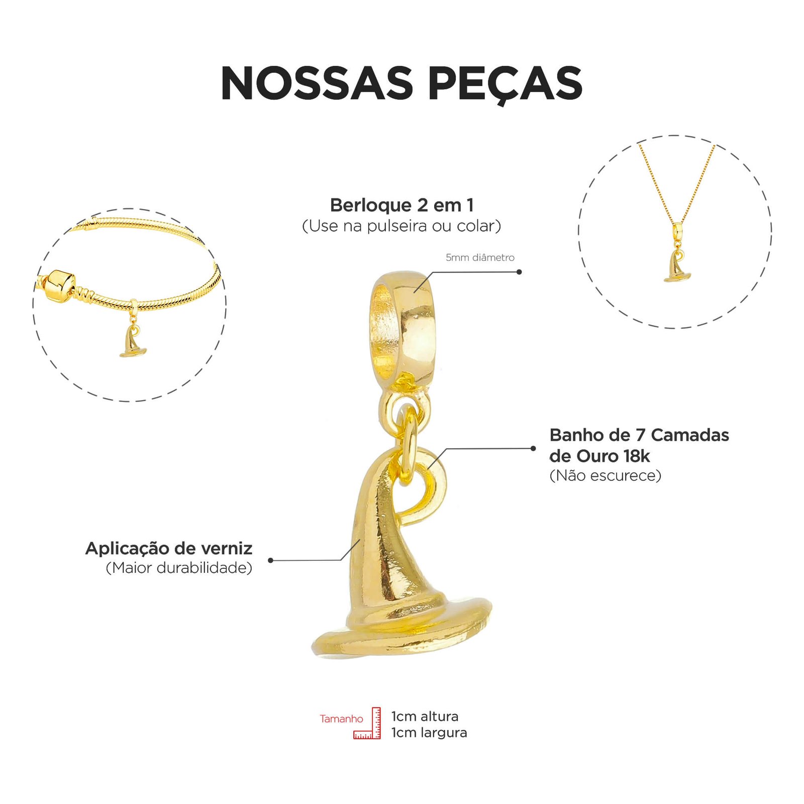MODELO: Berloque de chapéu de bruxa banhado com 100 milésimos de prata 925.