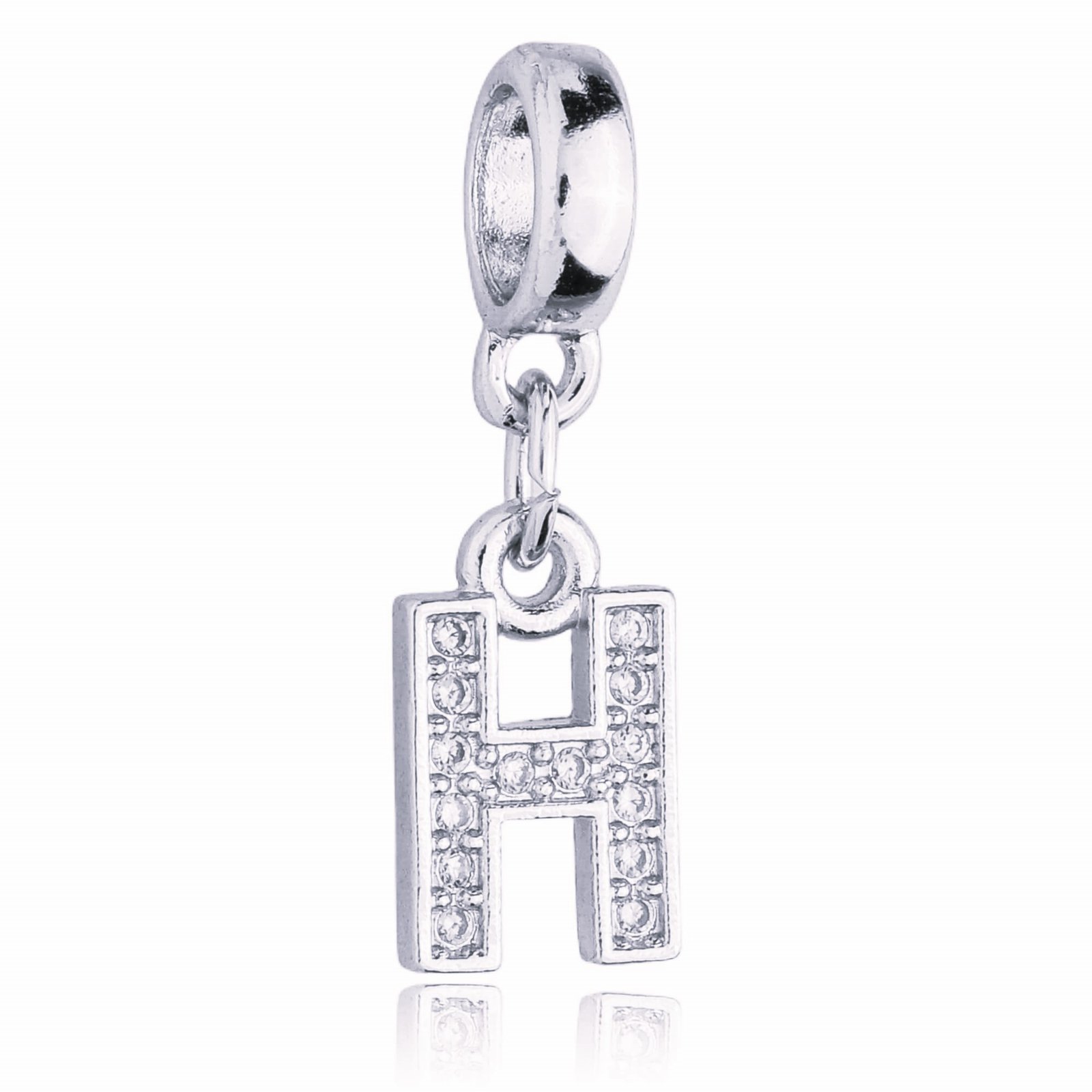 MODELO: Berloque Letra H Cravejada com Zircônia banhado com 100 milésimos de Prata 925.