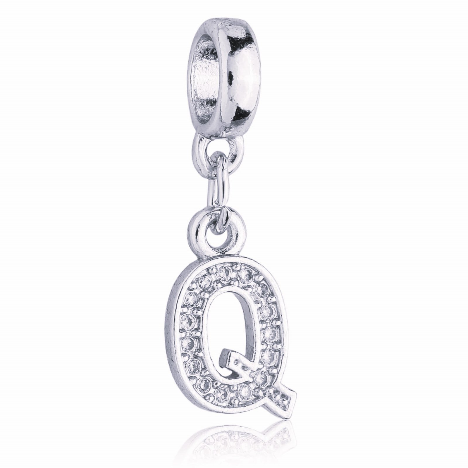 MODELO: Berloque Letra Q Cravejada com Zircônia banhado com 100 milésimos de Prata 925.