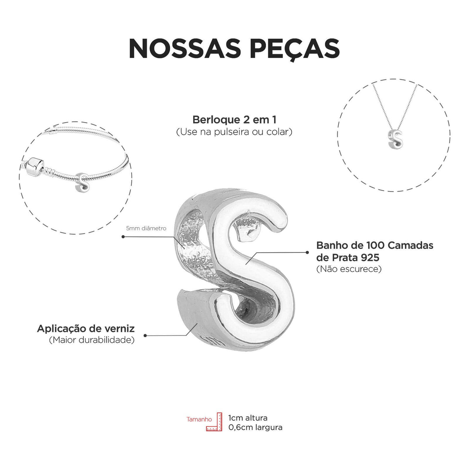 MODELO: Berloque de letra S para pulseira banhada com 100 milésimos de prata 925.