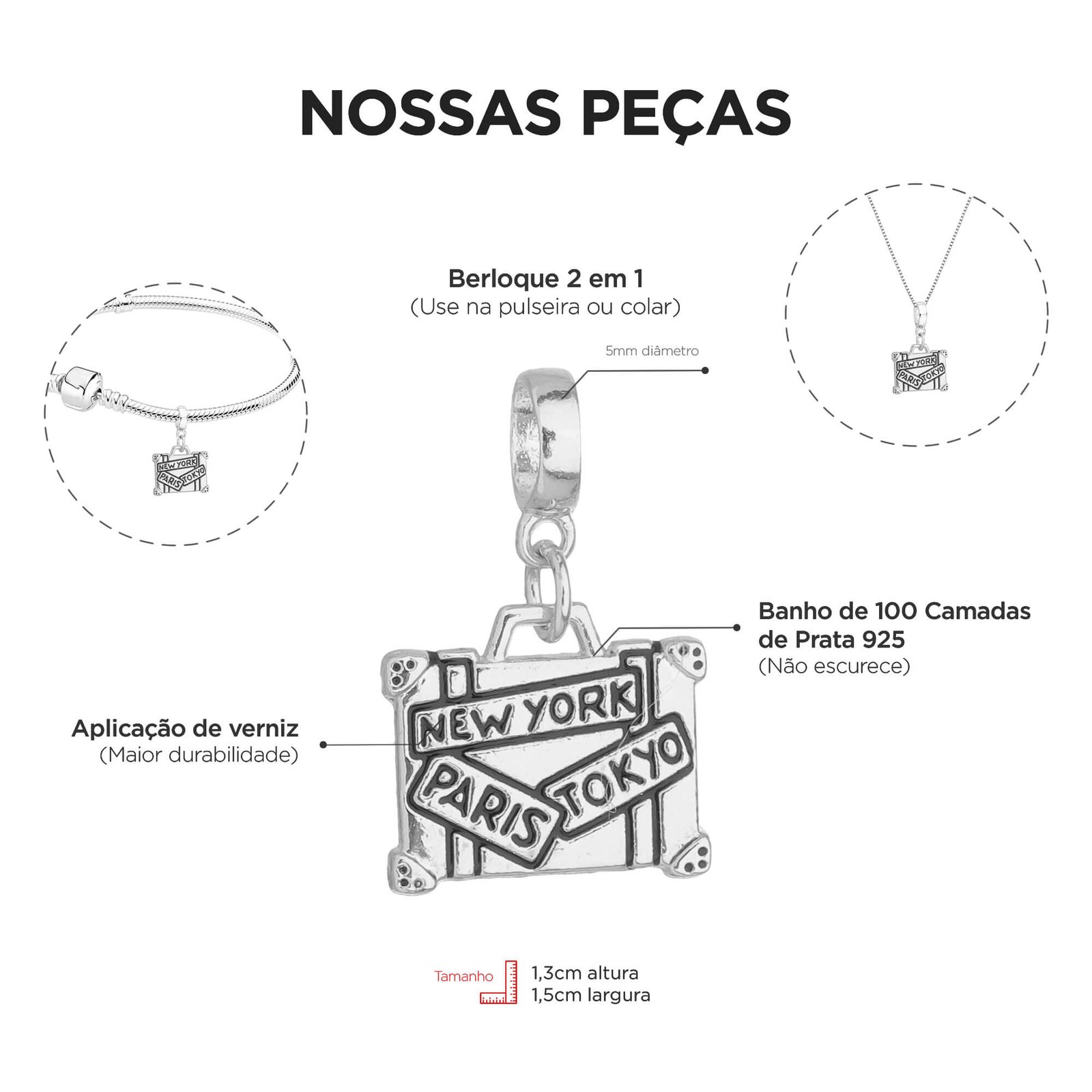 MODELO: Berloque mala de viagem banhada com 100 milésimos de prata 925.