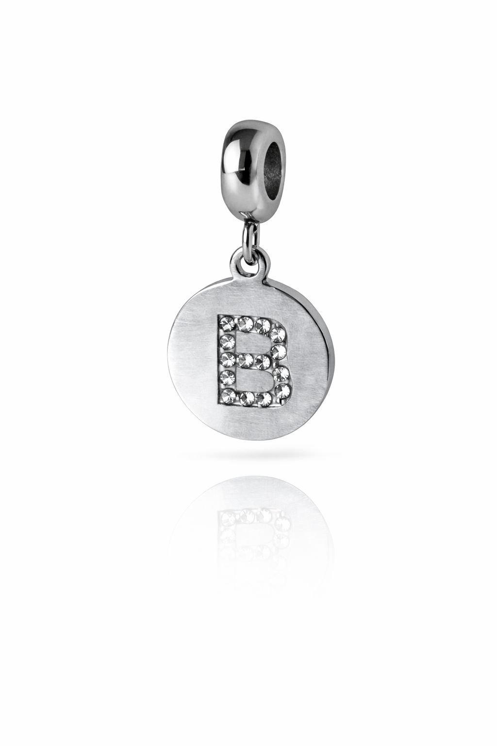 Berloque Medalha Letra B Redonda Cravejada Zircônia em aço inoxidável.