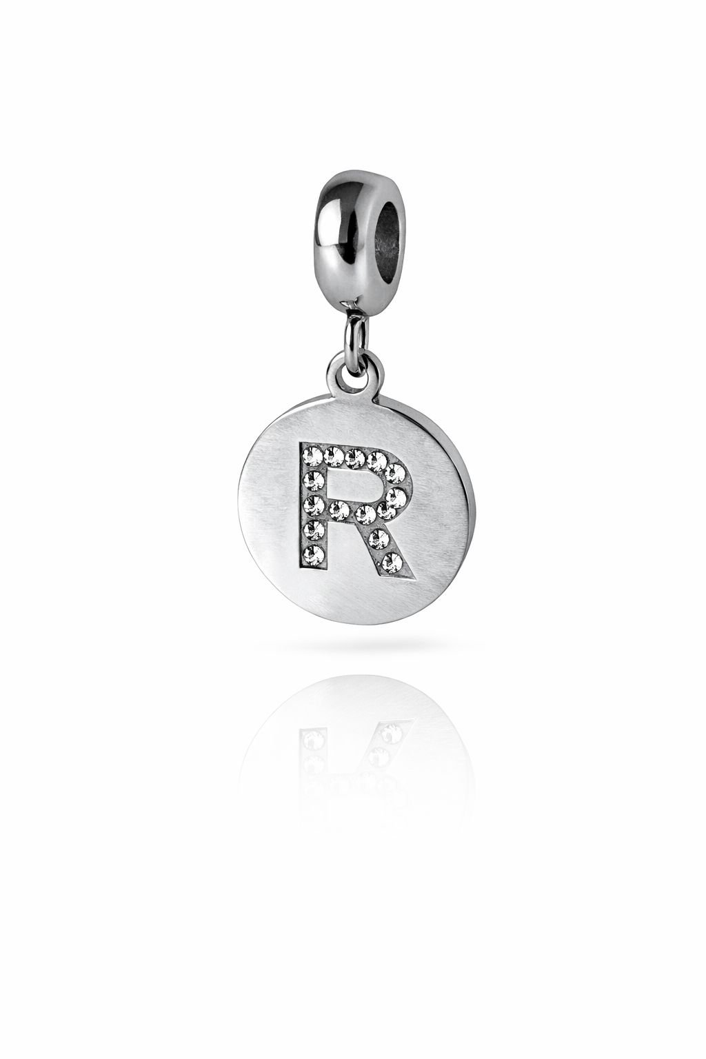 Berloque Medalha Letra R Redonda Cravejada Zircônia em aço inoxidável.