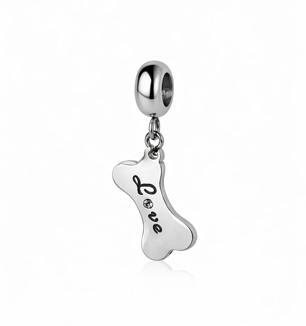 Berloque Osso Cachorro Love Cravejado Zircônia em aço inoxidável.
