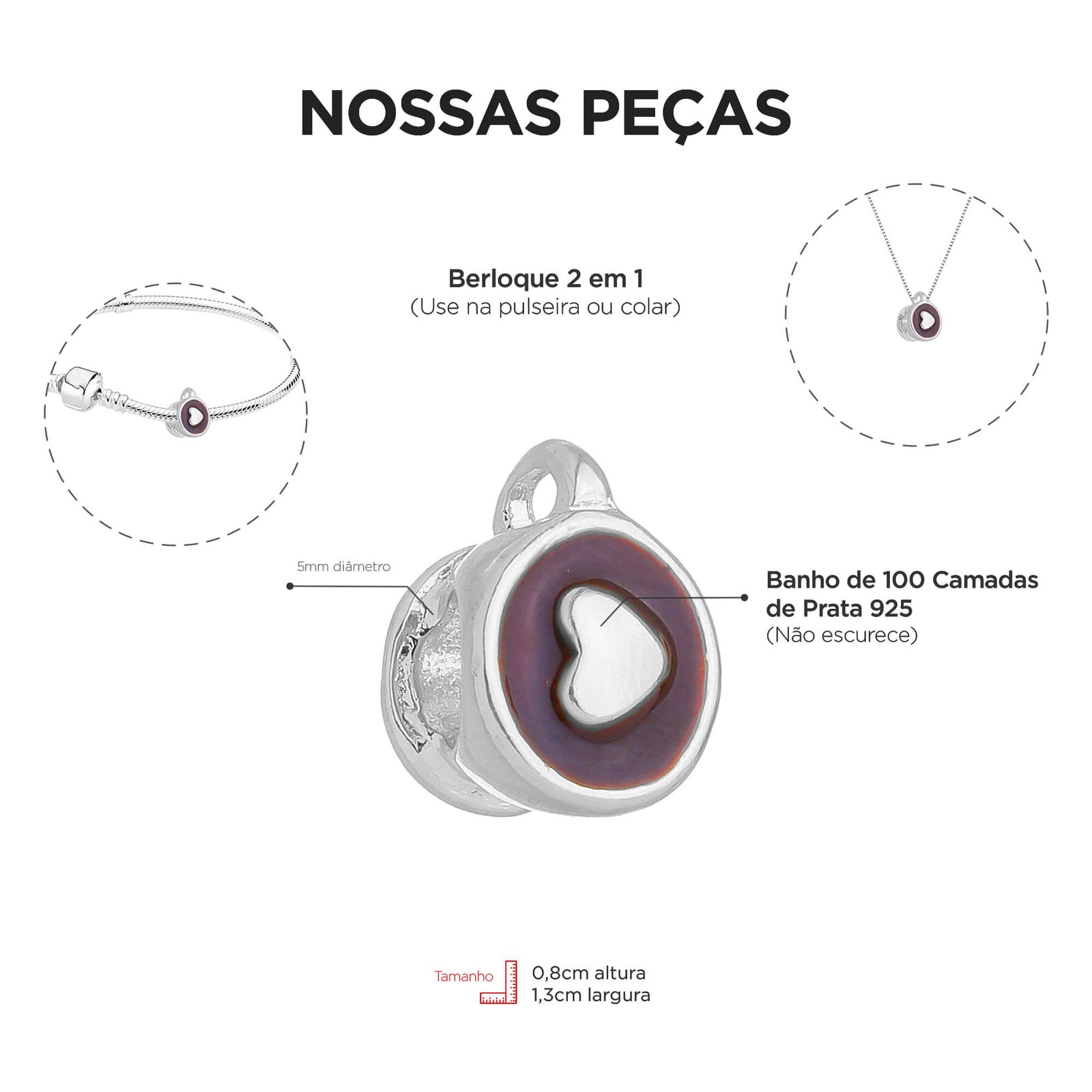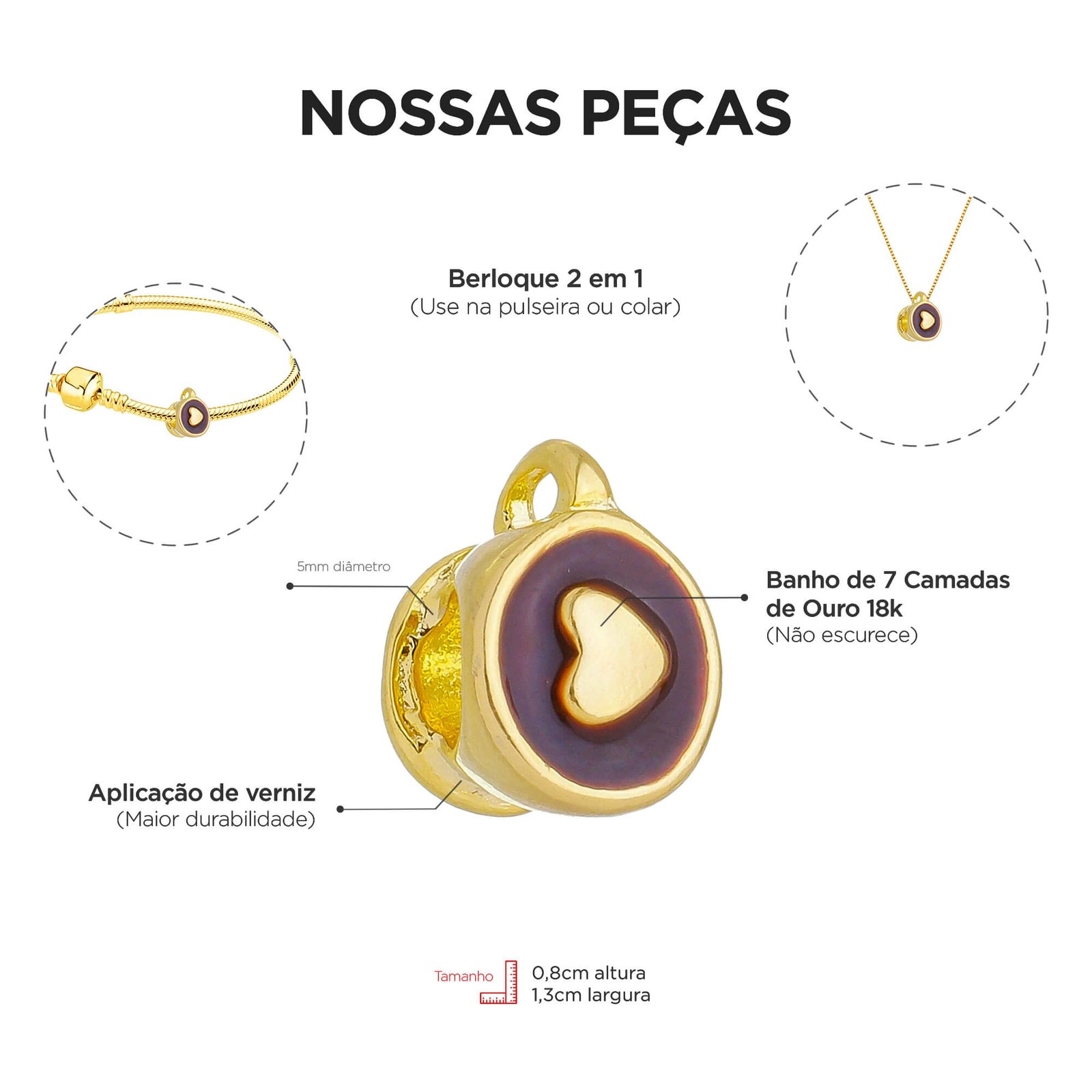 Somos uma fábrica de Semijoias Premium e a única do Brasil com berloques 2 em 1, onde você pode usar na pulseira e no colar. São mais de 1 mil modelos únicos para você escolher.
