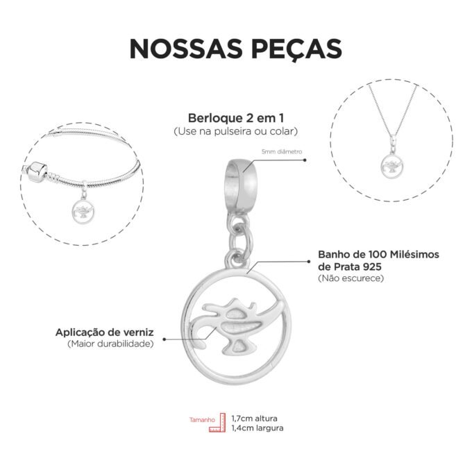 Peça banhada com 100 milésimos de prata 925, aplicação de verniz e 1 ano de garantia.