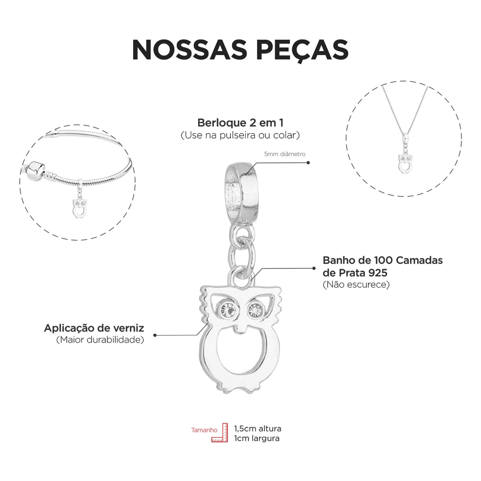 Peça banhada com 100 milésimos de Prata 925, aplicação de verniz e 1 ano de garantia.