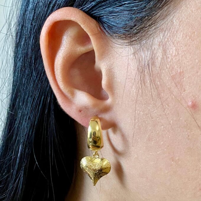 MODELO: Brinco Argola Lisa Pingente Coração Texturizado Dourado banhado com 7 milésimos de ouro 18k.