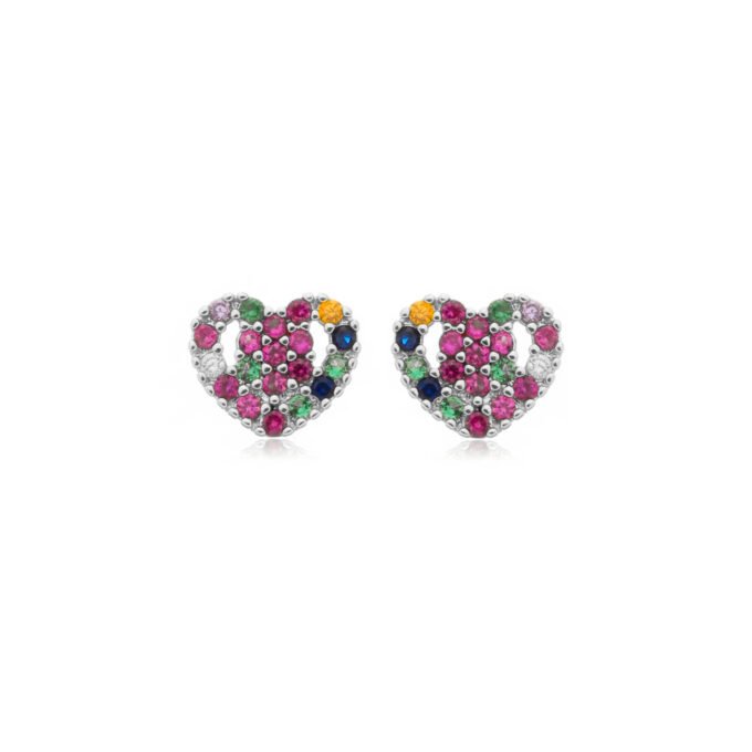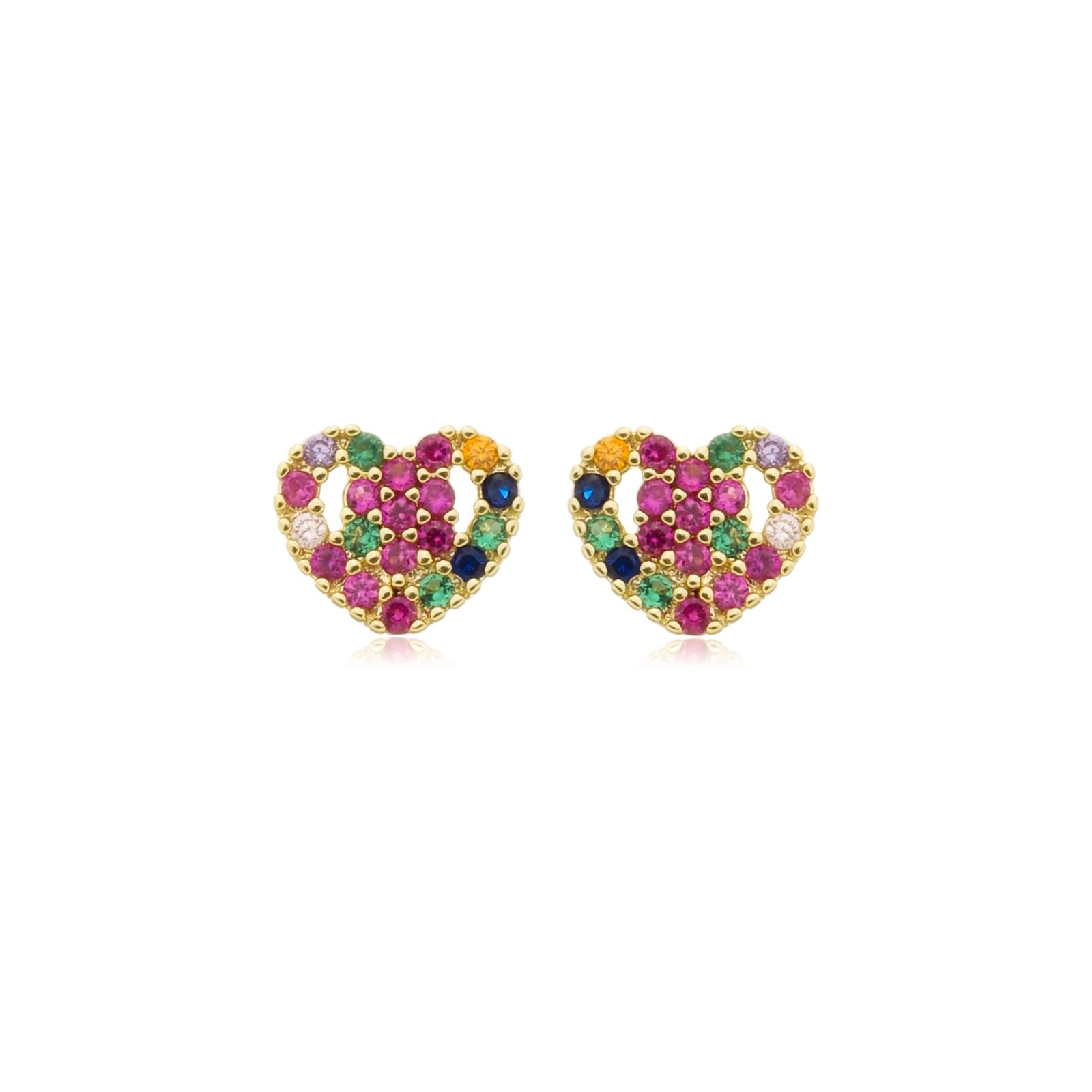 MODELO: Brinco Coração Cravejado Zirconia Multicolor Dourado banhado com 100 milésimos de prata 925.