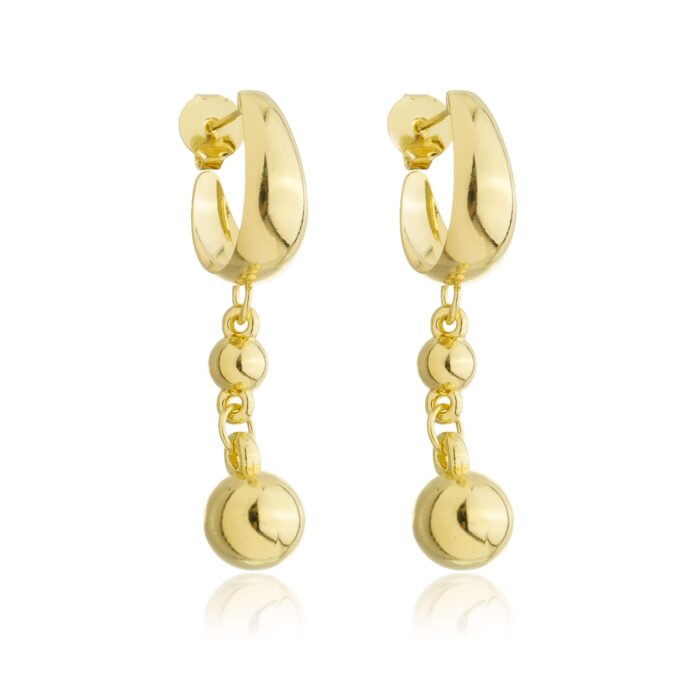 MODELO: Brinco Meia Argola 2 Bolinhas Penduradas banhado com 7 milésimos de ouro 18k.