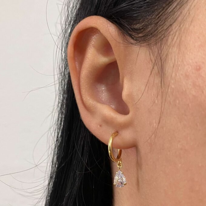 MODELO: Brinco Meia Argolinha Com Pingente Gota De Zircônia Cristal banhado com 100 milésimos de prata 925.