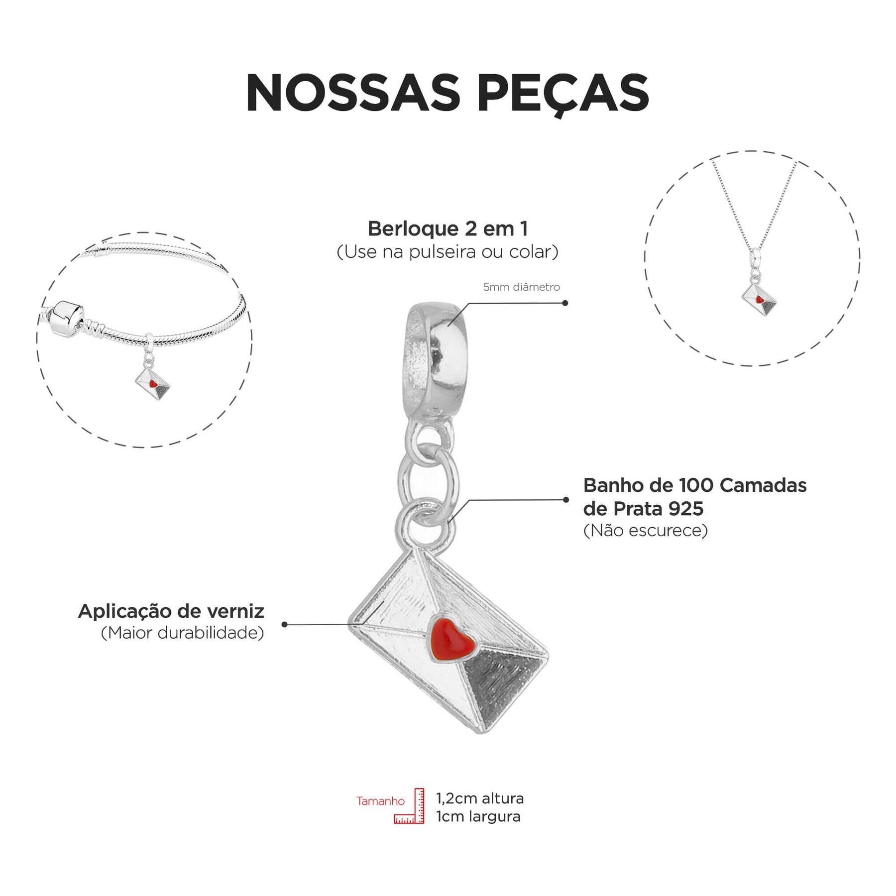 MODELO: Berloque de carta com coração banhada com 100 milésimos de Prata 925.